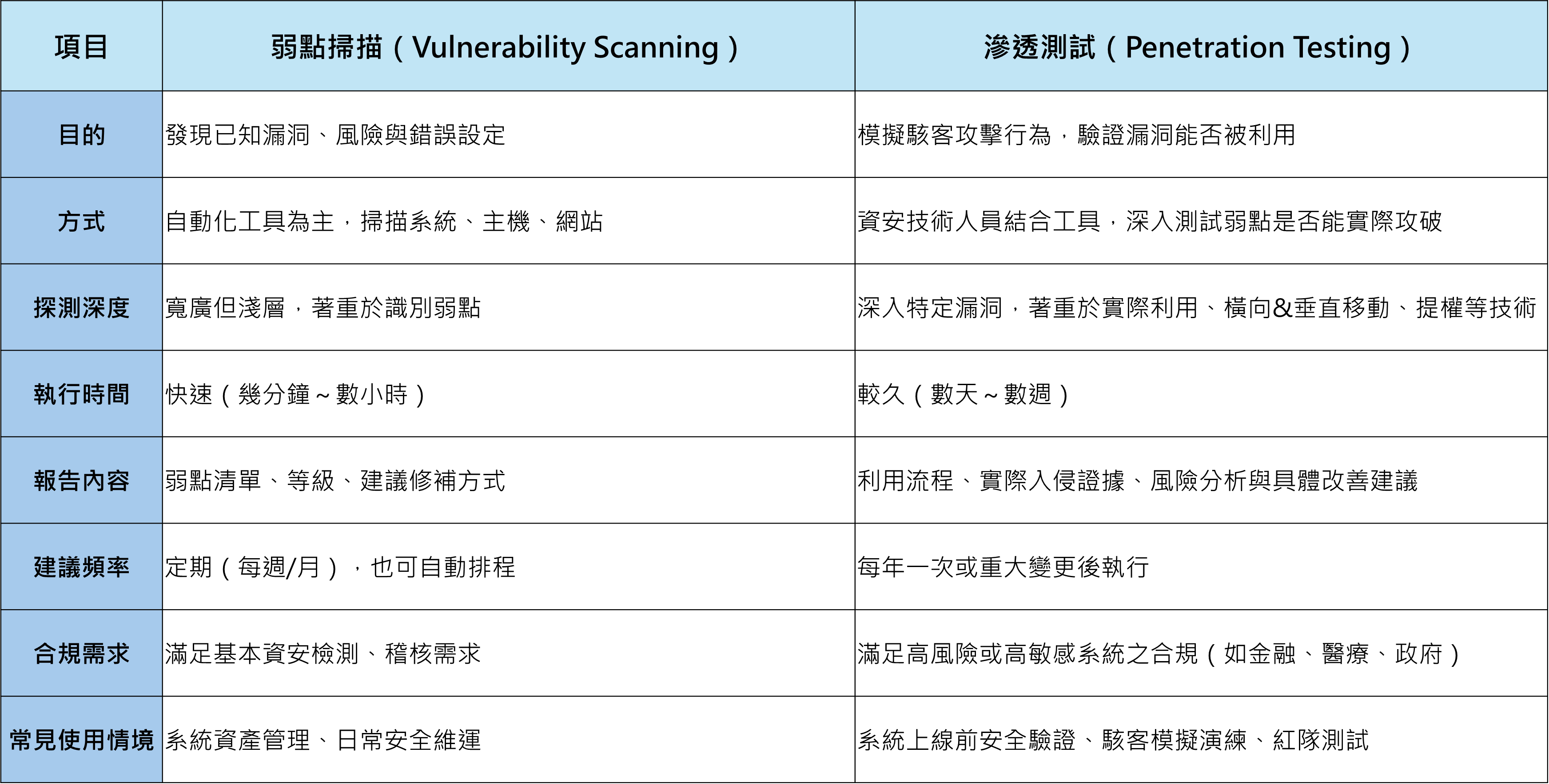 弱點掃描 vs 滲透測試 差異比較表