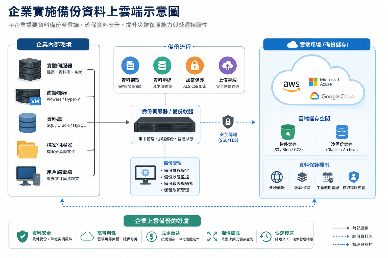 確保業務連續性 (Business Continuity): 當意外發生時,雲端備份能提供多樣化且快速的復原選項,最大限度地縮短停機時間。